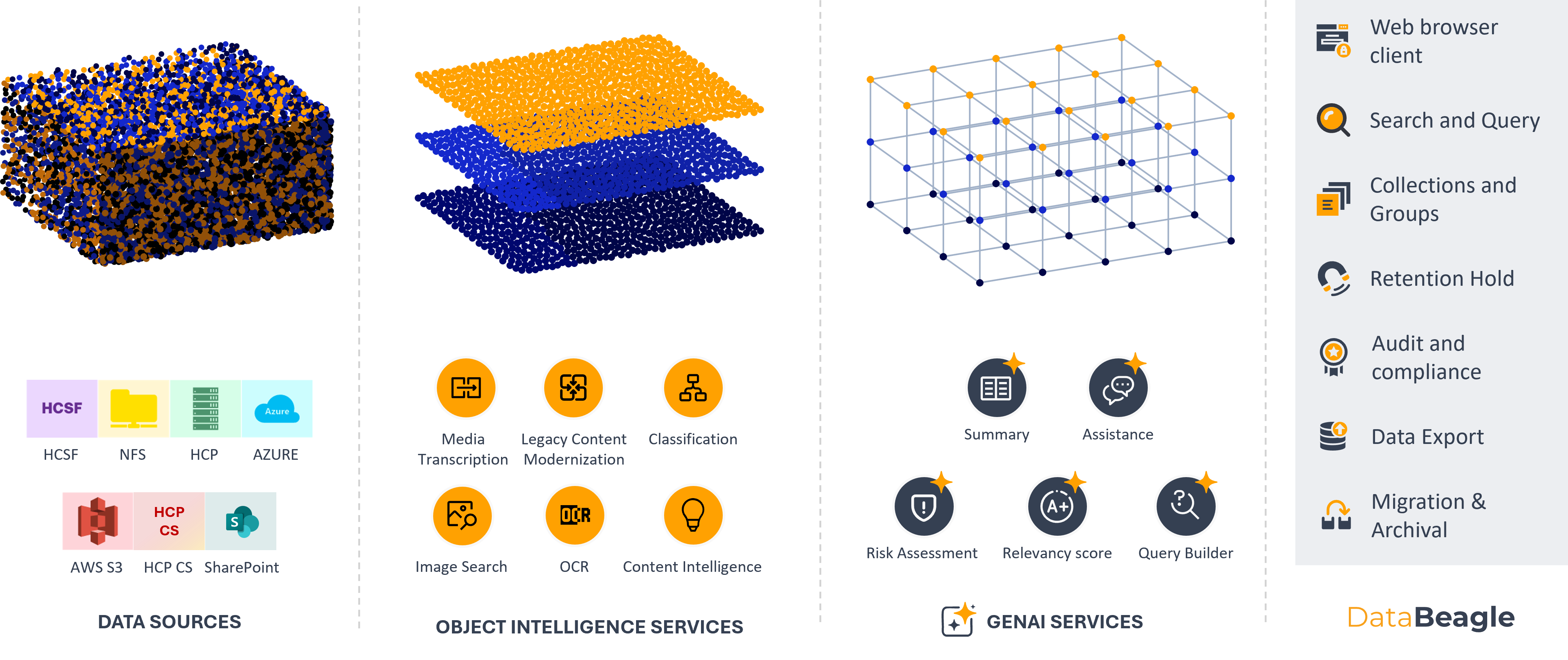 Data Sources Connect effortlessly with cloud and on-premise storage, including HCSF, NFS, HCP, Azure, AWS S3, and SharePoint.